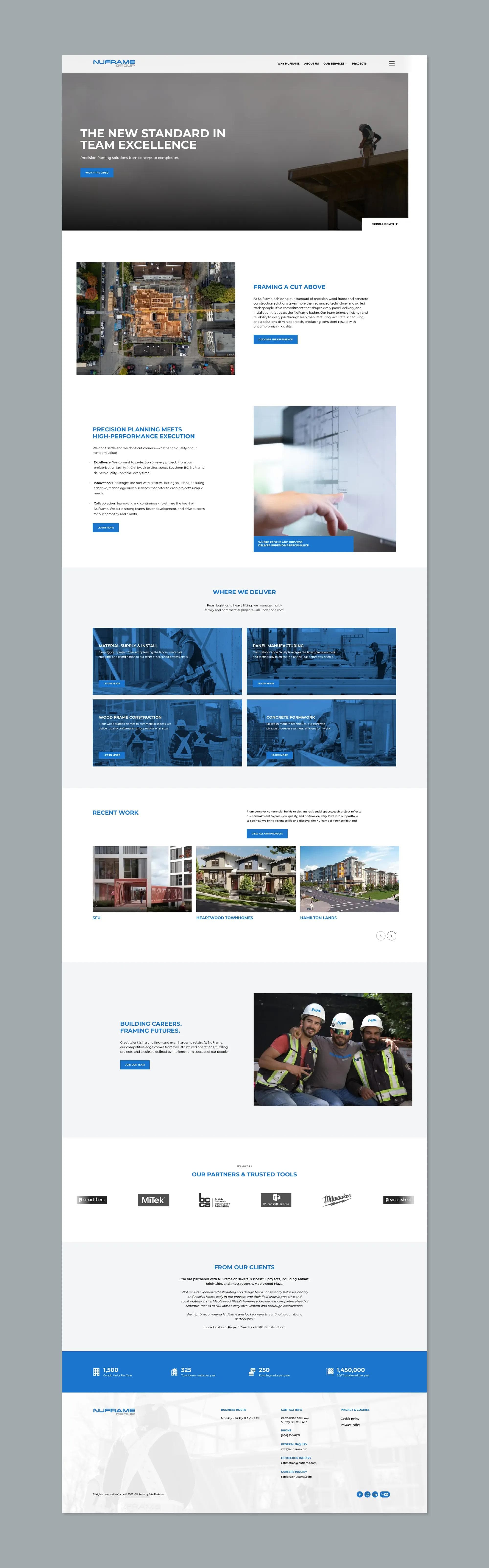 Site collaborated with NuFrame to expand their brand through video, voice, and web. We developed a clear strategy and brand guidelines that positioned NuFrame as a comprehensive solution provider—from material supply and off-site manufacturing to on-site installation. A new website, photo and video assets, and a stronger social media presence brought this positioning to life, showcasing their commitment to innovation, lean manufacturing, and scheduling precision. By grounding the brand in “People + Process = Performance,” we helped NuFrame communicate its value with clarity and confidence, creating a foundation to support growth and expansion.