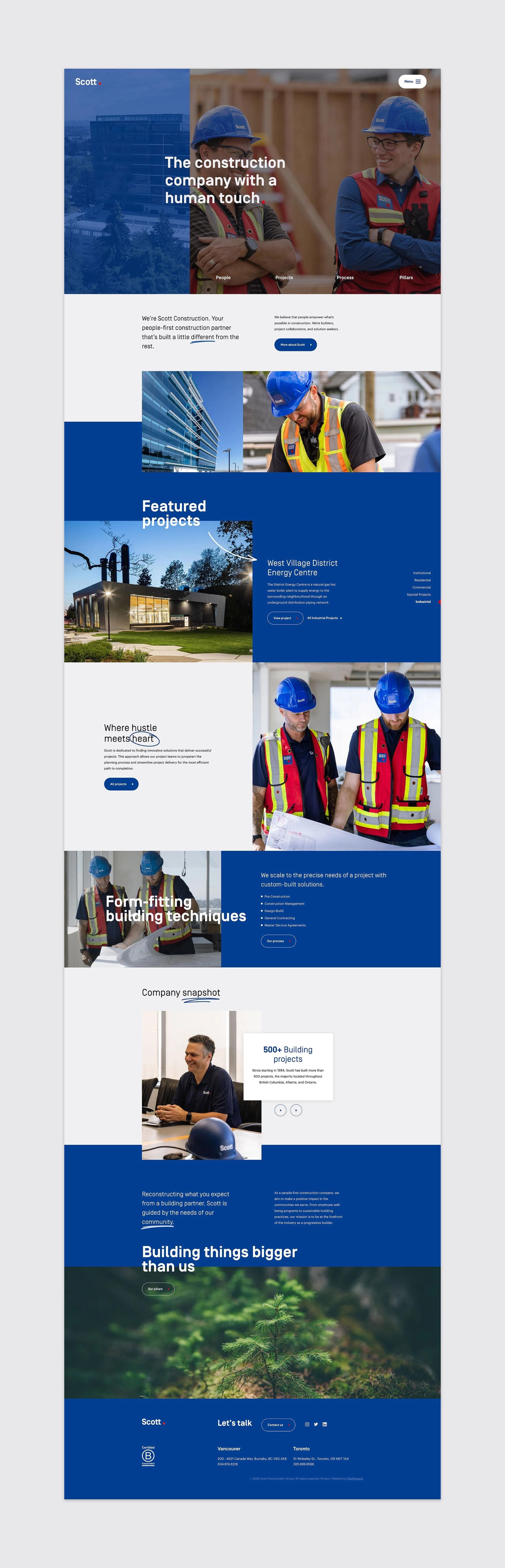 In the world of construction, it can be difficult to stand out amongst the crowd. While Scott Construction is an established builder with a proven track record and impressive project portfolio, they had difficulties telling their story and communicating what matters most to them. This, combined with an outdated website, made it difficult for them to clearly convey their identity. So they came to Site to help them communicate their people-first approach, collaborative process, and their commitment to the communities they work in.